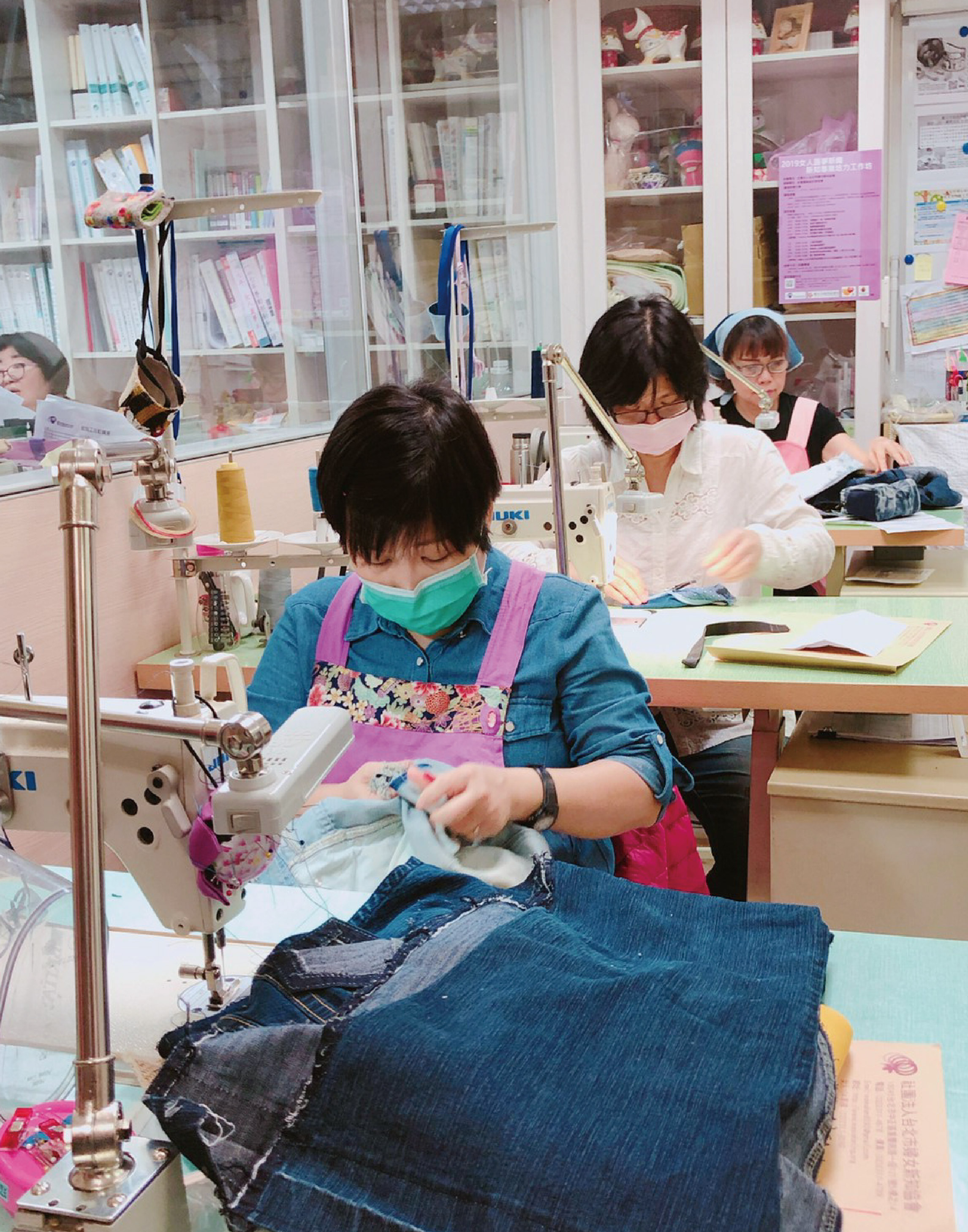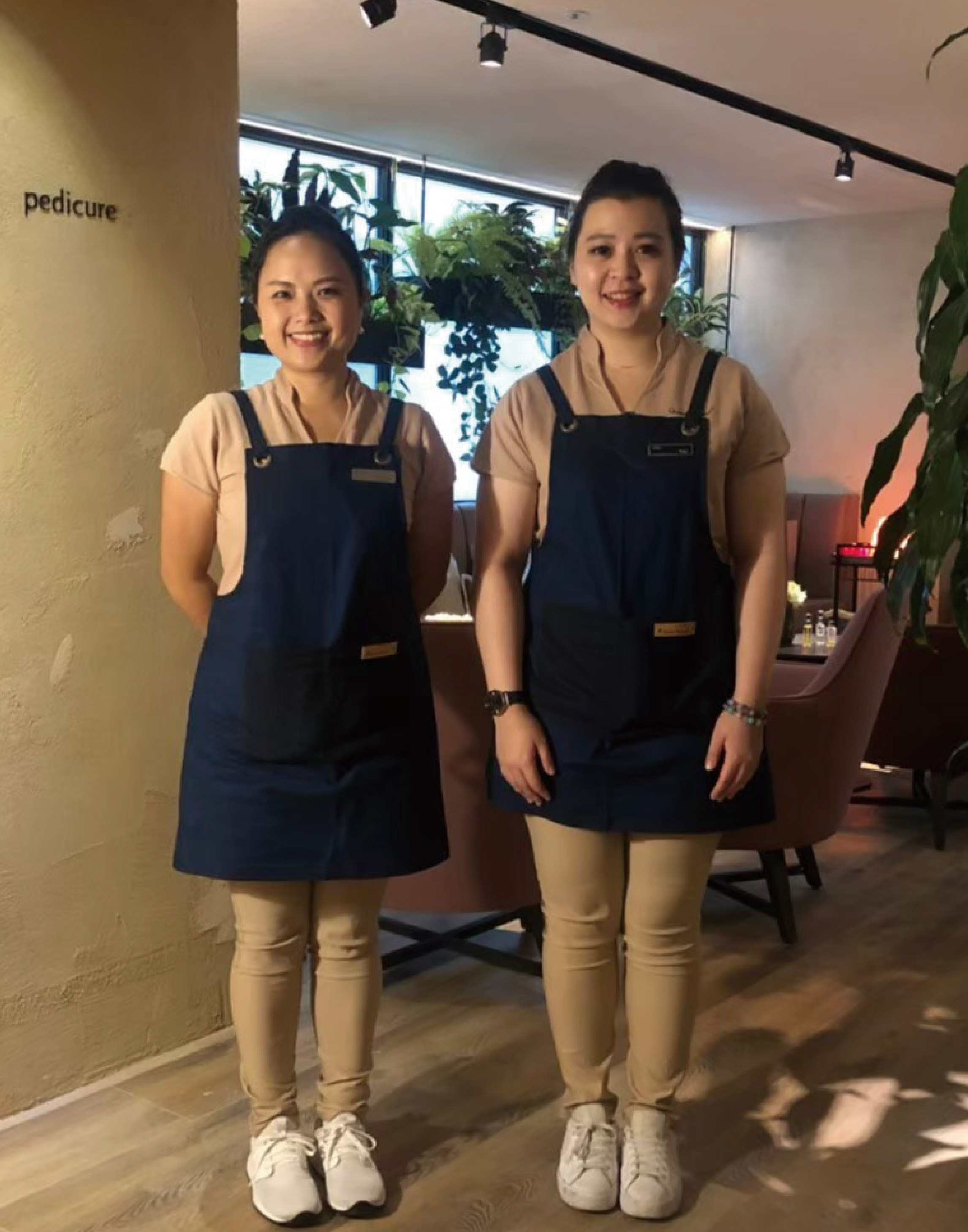 服務客人最密切的「芳療師」由社會企業品牌「Story Wear 零廢棄時尚」為登琪爾打造符合服務流程與使用特性的專屬圍裙。從回收二手衣物、拆解二手牛仔褲、版型設計、配件選擇到最後由二度就業婦女與腦麻家庭車縫、組合而成,落實循環經濟,將環保、時尚與社會企業完美結合。
