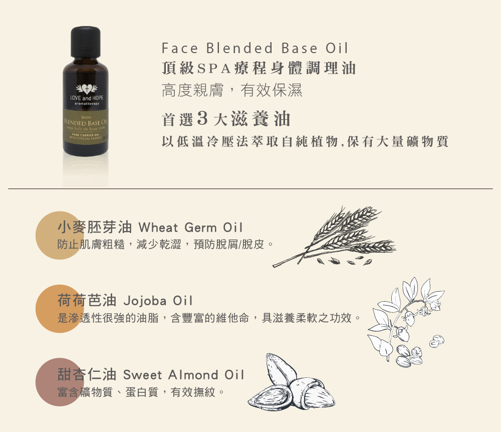 主要成份:小麥胚芽油、椰子油、甜杏仁油、荷荷芭油