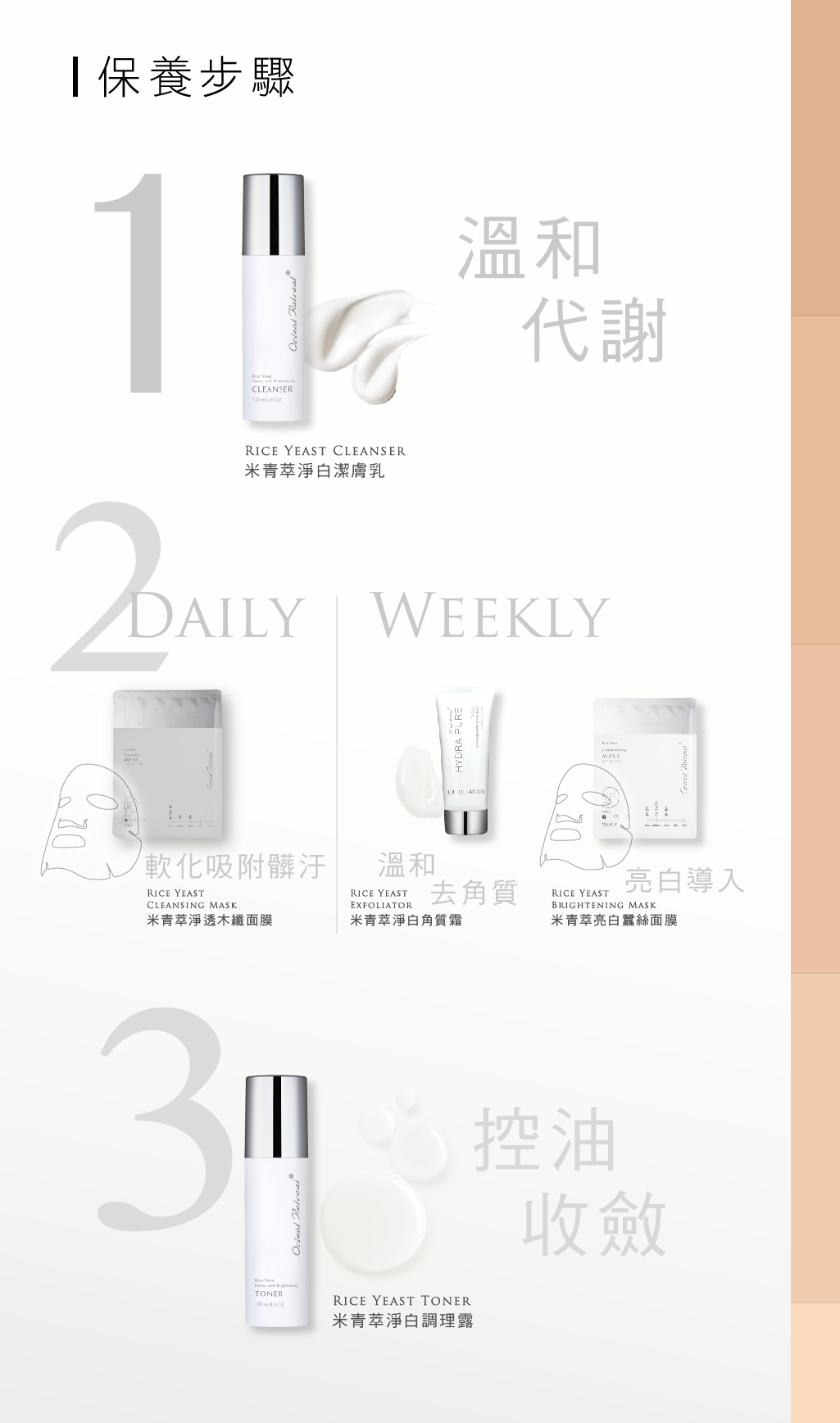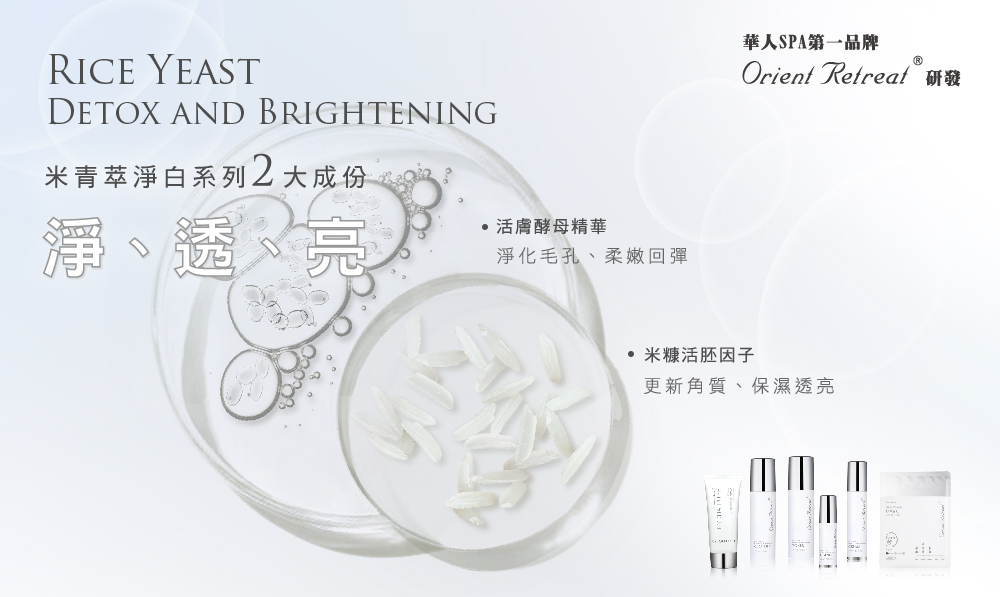 主要成分:米糠萃取、酵母萃取、淨白植物酸、橙花精油等