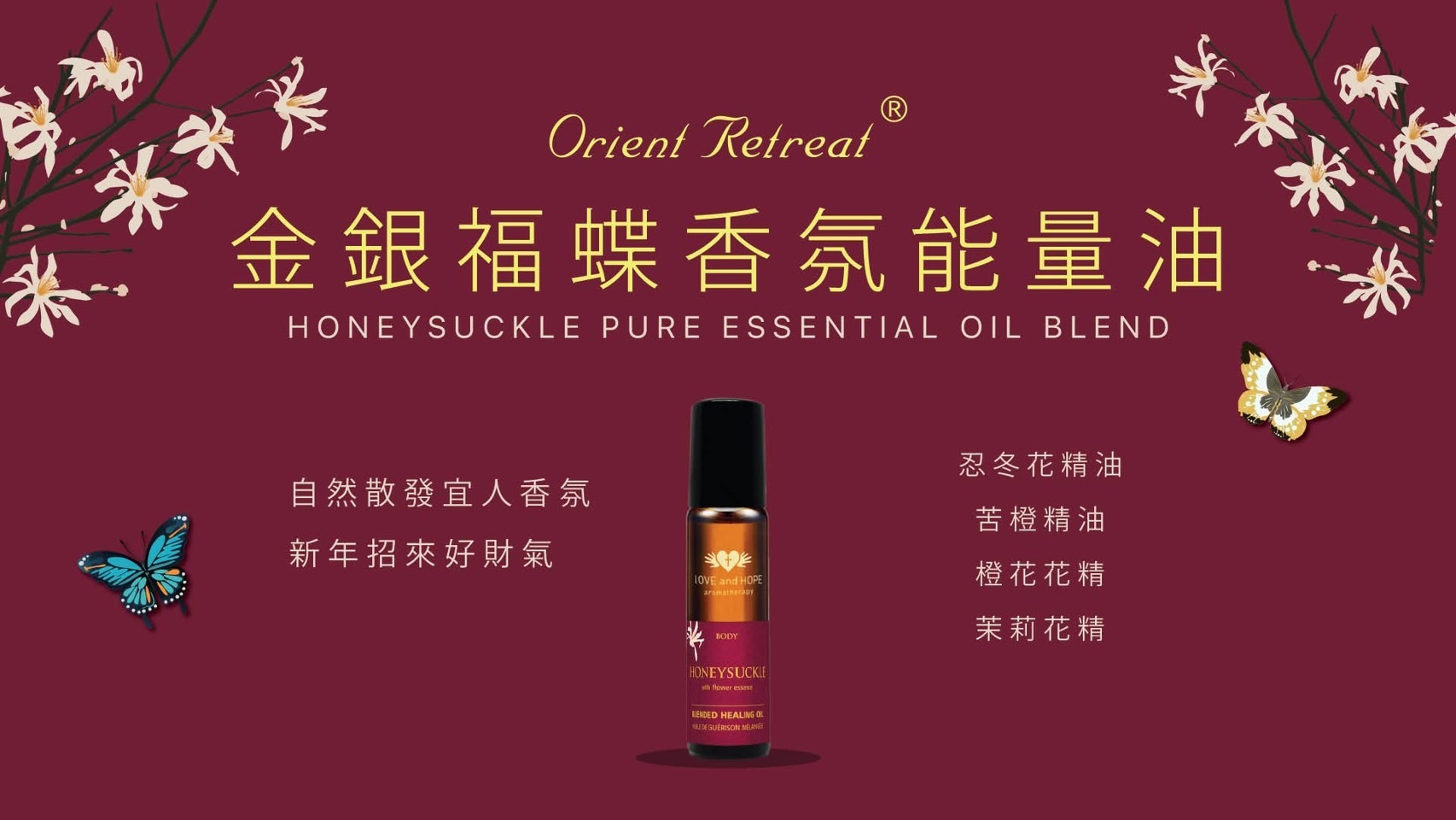 特色成分:忍冬花精油、苦橙精油、 荷荷芭油、橙花花精、茉莉花精(全成分請參考瓶身標示)