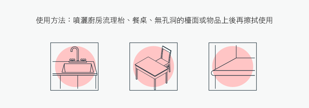 使用方法:噴灑廚房流理枱、餐桌、無孔洞的檯面或物品上後再擦拭使用